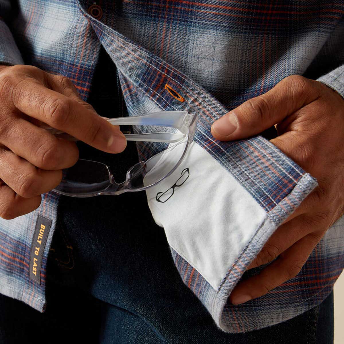 - Hidden microfiber lens cloth on shirt tail