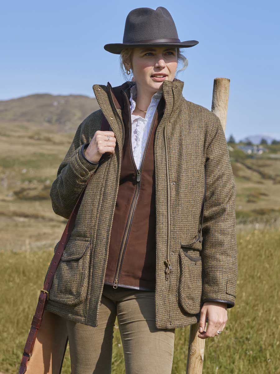 Be ready for any shoot with the Dubarry Ballynahinch Tweed Shooting Jacket. Tailored for a feminine silhouette, it features a Teflon® coated wool outer layer and a GORE-TEX liner for unbeatable protection against the elements. Practical and functional features, including knitted wool cuffs, fleece lining, and a variety of pockets, mean you can keep your equipment securely stored while being warm and comfortable. Experience the ultimate in shotshell protection with the Ballynahinch jacket!