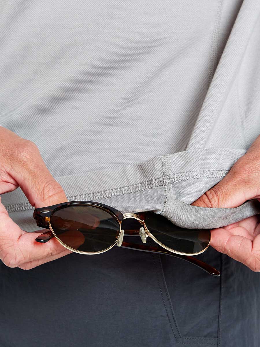 - Sunglasses holder loop and discreet eyewear cleaning patch hidden in hem