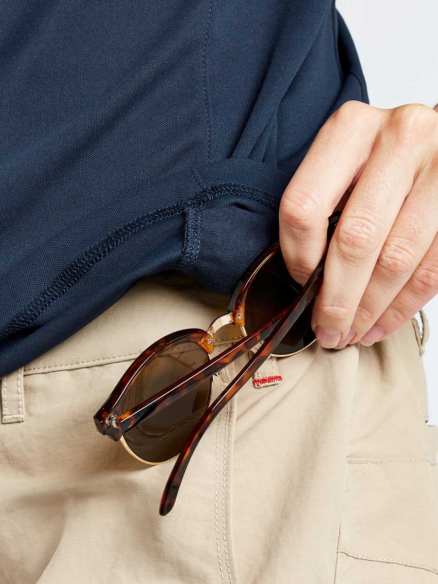 - Sunglasses holder loop and discreet eyewear cleaning patch hidden in hem