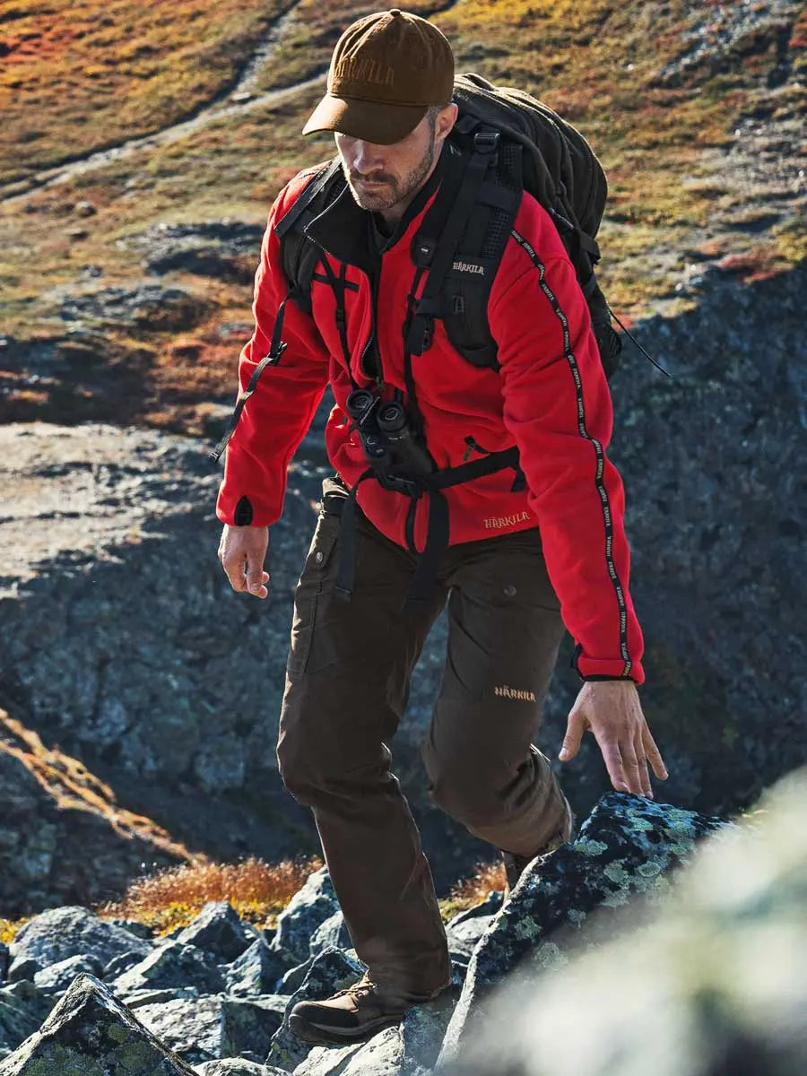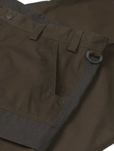 The Harkila Asmund trousers are made from a robust, water-repellent waxed canvas, 82% cotton and 18% polyester. The trousers are DWR (Durable Water Repellent) treated. This makes them dirt- and water-repellent because the water pearls up on the surface of the fabric instead of soaking in. The trousers have two slanted front pockets and two thigh pockets with press stud closures. The right-hand thigh pocket has two compartments, with a velcro closure. On the waistband of the Asmund trousers is a D-ring for attaching various items of equipment.