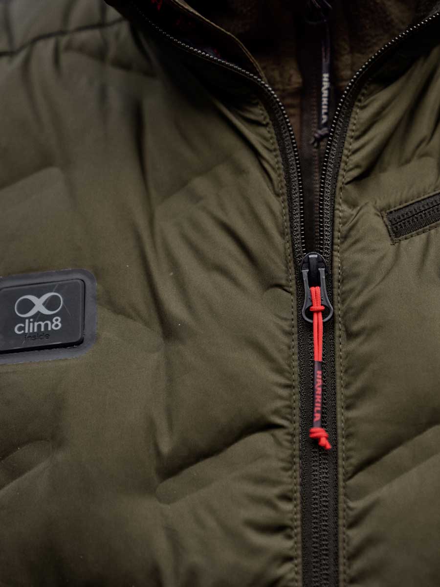 The Härkila Heat clim8 insulated waistcoat is an intelligent heating waistcoat that adapts the electronic heating capabilities to suit the weather, the hunter’s level of activity, as well as the custom heat setting of the wearer. Everything is controlled by the set-and-forget clim8® app. The app is only required during the set-up process, once the product has been paired your personal profile will be transferred to the jacket and your custom settings will be applied. The app can also be used to fine-tune the temperature in case you want to set a specific temperature. The waistcoat is insulated with down and is wind resistant. It features a reflective lining that retains the generated heat and directs the warmth back toward your torso. The clim8® waistcoat is powered by a USB cable that plugs into a power bank. The waistcoat is fitted with a stow pocket for your power bank. The power bank is not included. We recommend that you use a power bank of at least 10,000mAh and that it has an output of 5V/2,1A.