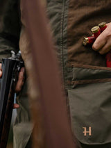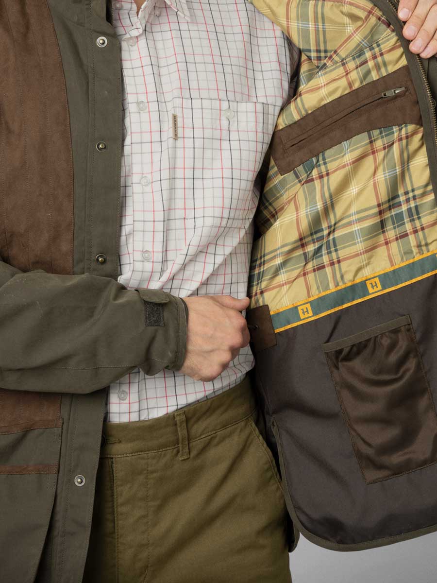 The Harkila Rannoch HWS Shooting Jacket is a classic garment ideal for any weather on shoot days. Constructed from lightweight, durable fabric with microsuede-reinforced front pieces, it ensures 100% weather protection with its HWS® Härkila Weather System dropliner. Features include removable recoil pads, large cartridge pockets with drain holes, a mesh mobile pocket and a waist adjustment system for a perfect fit. The jacket also boasts a 2-way zip front for convenience when pockets are loaded and is lightly lined in a plaid material.