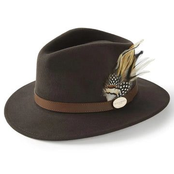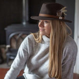 HICKS & BROWN Ladies Suffolk Fedora Hat - Guinea and Pheasant Feather - Dark Brown
