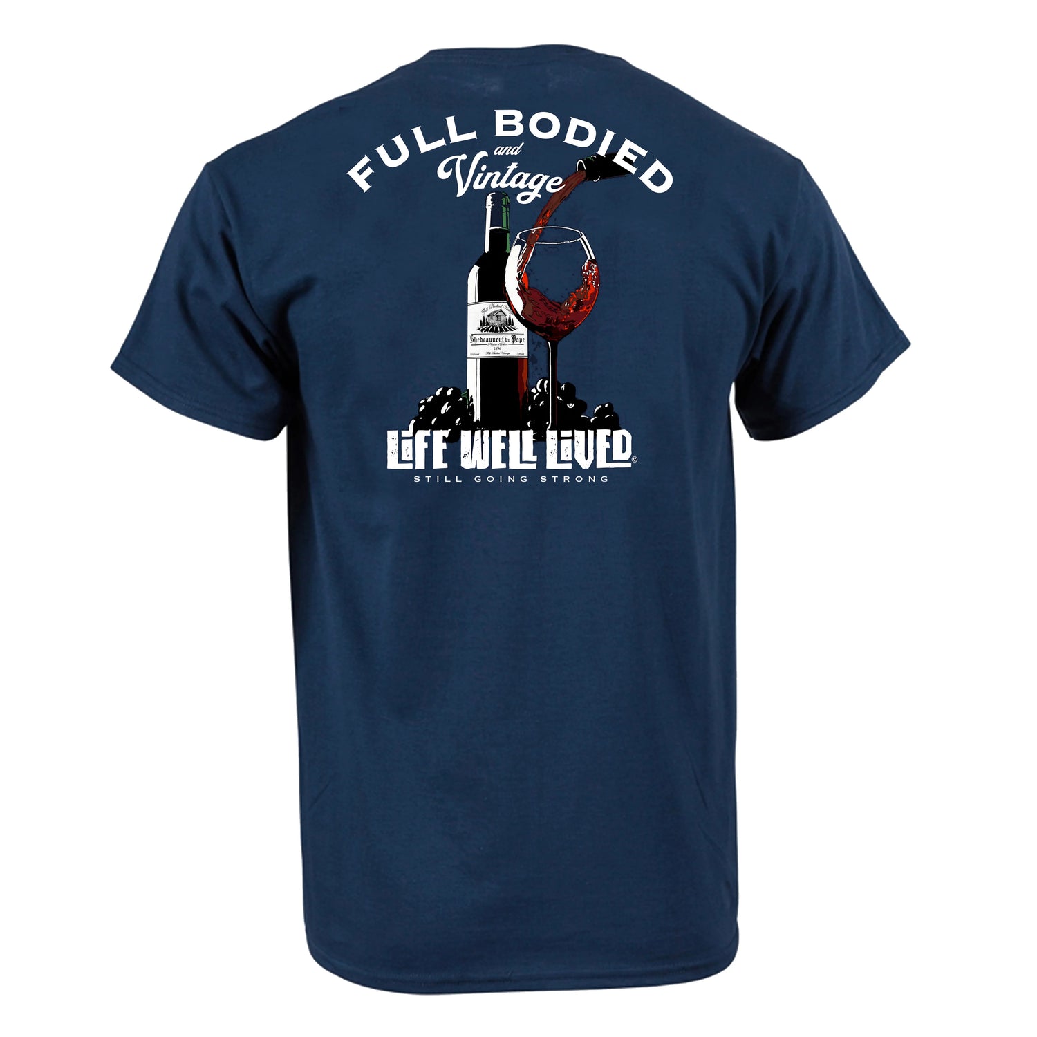 Good wine. Great stories. Timeless taste. The Full Bodied T-Shirt by Life Well Lived is a playful nod to those who appreciate bold flavour, classic character, and living life one pour at a time. Featuring an elegant graphic of red wine being poured into a glass, this tee blends humour, sophistication and relaxed style — ideal for wine lovers who enjoy the finer things with a wink and a smile.
