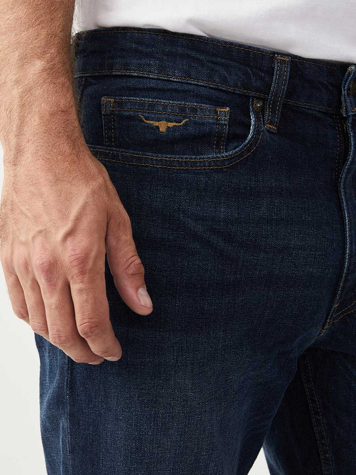 R.M.Williams Regular fit, tapered leg low-rise style with five pocket and zip fly. Finish with the high quality finer details of Longhorn stitching on the back pockets, R.M.Williams rivets and leather waist patch.