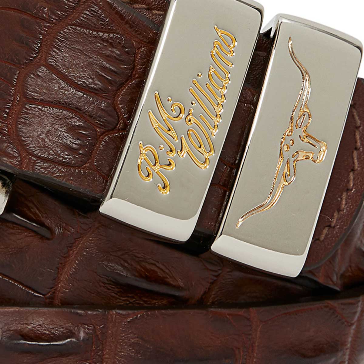 A classic from the R.M.Williams collection. 1.5 inches in width, this quality belt made from luxurious Crocodile leather is synonymous with prestige and style. Unique, intricate scaling patterns ensure a stunning look and feel with a high-end finish belt features a sturdy three piece logo buckle.