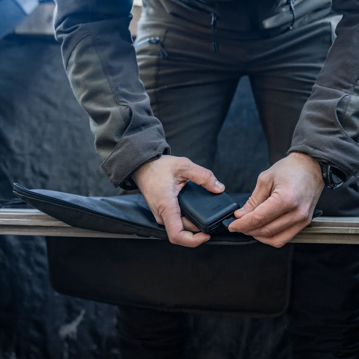 The seat pad folds neatly for transport, and when opened provides a 45 × 45 cm insulated sitting area. Inside, a heating element offers three adjustable temperature settings, giving you control over your comfort in varying conditions. Simply connect your own USB-C power bank (not included) to enjoy hours of steady warmth, even on the coldest days.