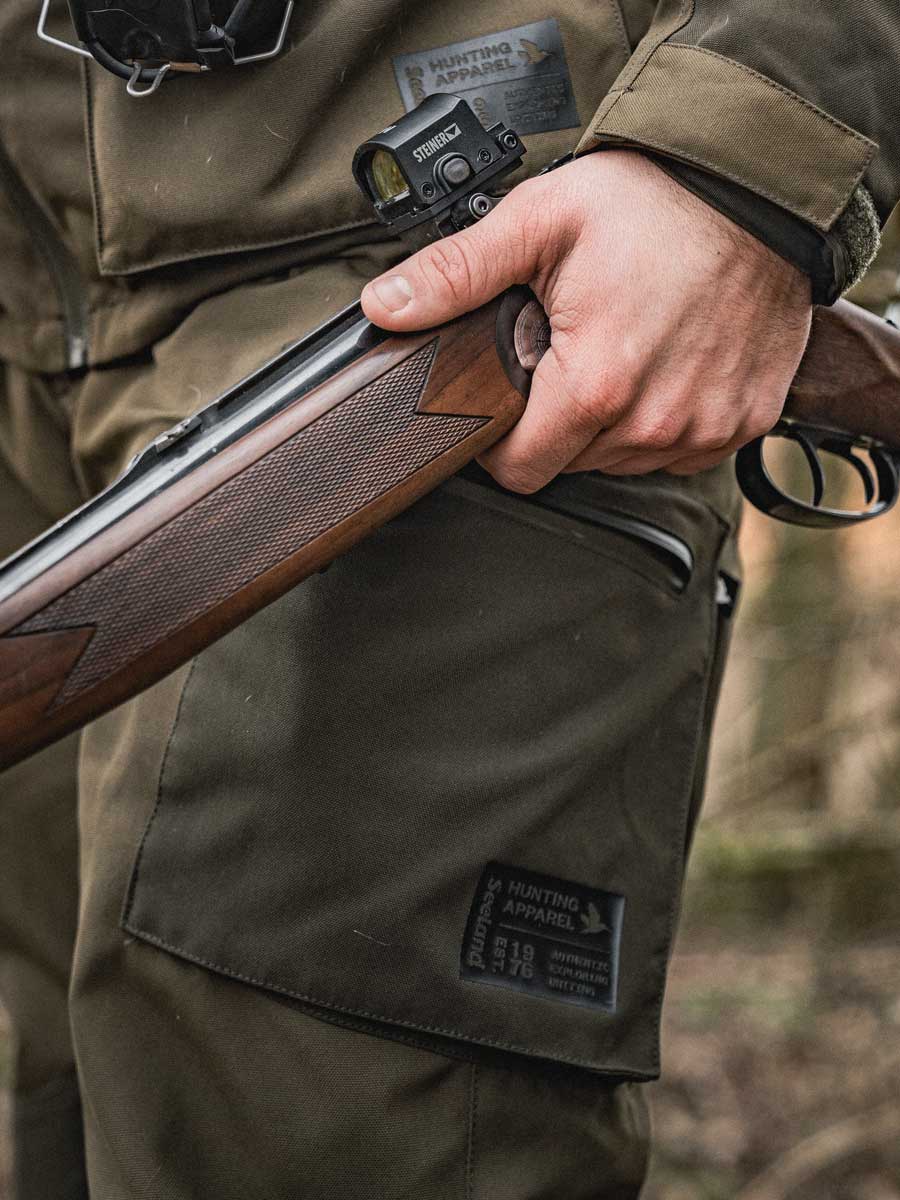 Seeland Trax Trousers with a PFAS-free Seetex® membrane and taped seams for maximum durability and protection. They feature water-repellent zippers, ventilation options and a cartridge holder for practicality. The design includes articulated knees, an elasticated waist and adjustable straps for a custom fit. Robust and ready for the wild, they're the ideal companion for those who take on challenging terrains. The Trax Trousers are the perfect match for the Trax Jacket and Cap, completing a full gear set for the dedicated hunter.