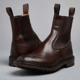 The Trickers Henry elastic sided brogue pull on boot has a storm welt, leather uppers and leather linings for extra solidity and comfort, together with a Commando rubber stitched sole for grip. In burnished Leather.