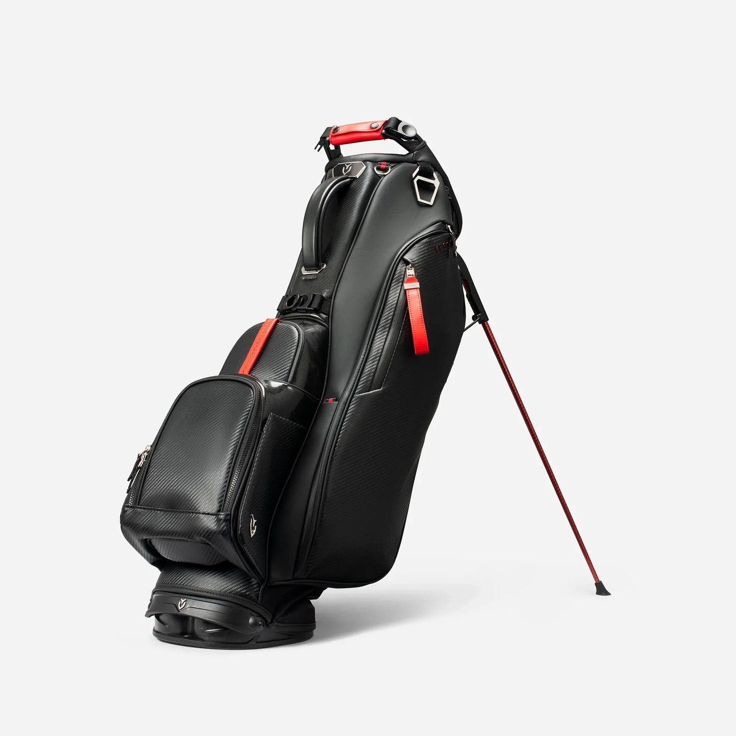The next evolution of golf’s most celebrated stand bag. The Vessel Player V is built for the ultimate carrying experience, pairing lightweight performance with refined detail. Every pocket — from hidden valuables storage to dual beverage holders — is purposefully placed for optimal access. Patented VESSEL tech, including the Equilibrium Double Strap and Rotator Base, ensures unmatched comfort, balance, and stability. With upgraded strap attachment points and a new cart strap pass-through, this stand bag transitions seamlessly from carry to trolley use — all wrapped in tour-grade materials and premium trims.