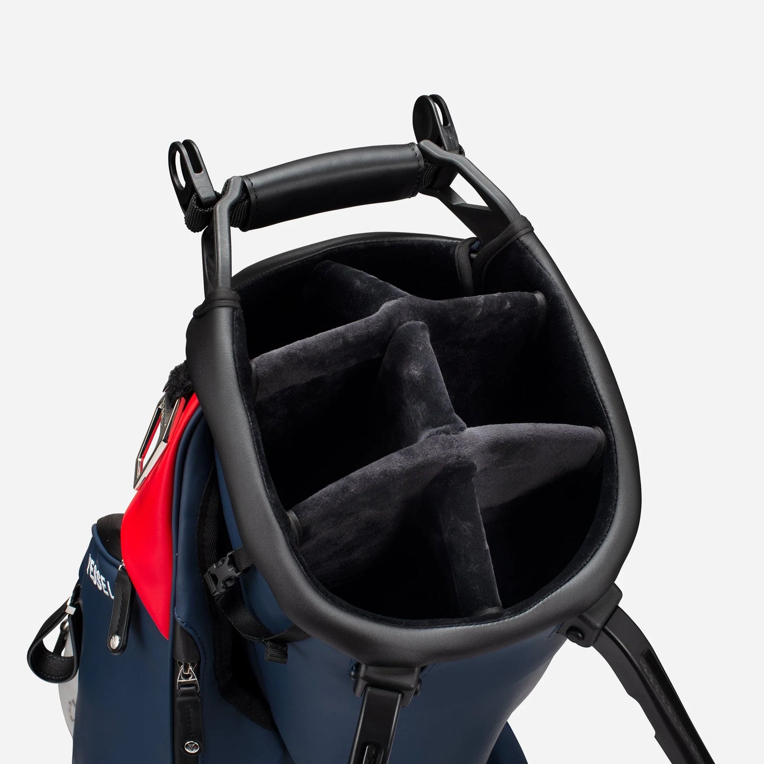 The next evolution of golf’s most celebrated stand bag. The Vessel Player V is built for the ultimate carrying experience, pairing lightweight performance with refined detail. Every pocket — from hidden valuables storage to dual beverage holders — is purposefully placed for optimal access. Patented VESSEL tech, including the Equilibrium Double Strap and Rotator Base, ensures unmatched comfort, balance, and stability. With upgraded strap attachment points and a new cart strap pass-through, this stand bag transitions seamlessly from carry to trolley use — all wrapped in tour-grade materials and premium trims.